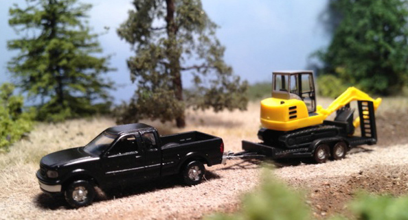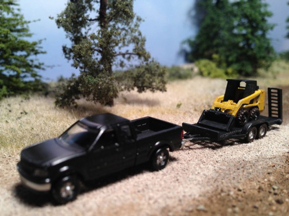 This Atlas Ford F-150 has been equipped with a trailer hitch to a GHQ equipment trailer. The trailer can be used to haul more than just the Bobcat from the GHQ kit, as shown here with a Wiking HR18 mini excavator.
