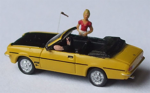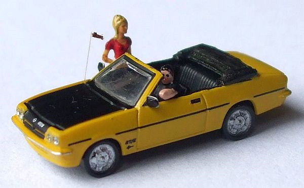 Opel did not offer a Manta B convertible, but at least two after market conversions were available.  Markus disassembled this Herpa Opel B, removed the top, and fabricated the folded soft top from black cardboard.  He also created "Irmscher" dual headlights and added mirrors and a chrome tailpipe.