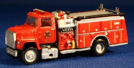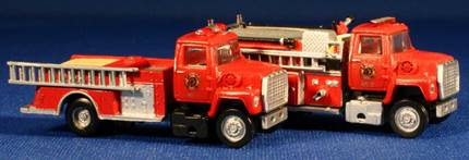 The engine on the left is a Ford/American LaFrance rural pumper. The prototypes were cranked out by the hundreds in the '70s and '80s. They were sold as replacements for aging American LaFrance 700 and 900 pumpers. To keep costs low, bodies were often refurbished and optional equipment like foam and hose reels were left off. This model uses an Atlas Ford LNT cab and chassis with a Bachmann American LaFrance 900 body. The light bar was borrowed from an Athearn pumper. The Ford/KME pumper shown on the left has an Athearn pumper body mounted on an Atlas Ford LNT cab and chassis. This was a very quick project taking only about an hour, including the painting. Dan will add side view mirrors to finish the model. The light bar is a clear plastic strip painted with Tamiya clear red.