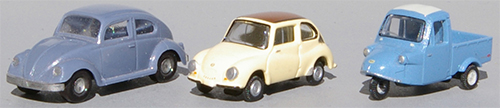 From left to right: Wiking VW Beetle, TomyTec Subaru 360 and Daihatsu Midget MP