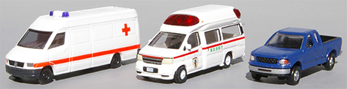 From left to right: Busch Mercedes Sprinter, TomyTec Nissan ambulance and Atlas Ford F-150