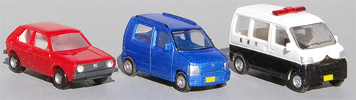 From left to right: Wiking VW Rabbit, TomyTec Suzuki Wagon and Daihatsu Hijet Cargo